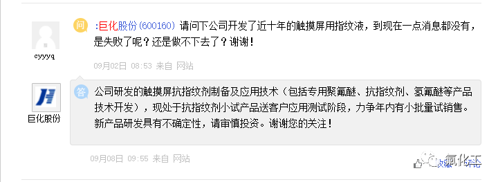 近日,巨化股份在上证e互动回答投资者时表示:公司研发的触摸屏抗指纹剂制备及应用技术(包括专用聚氟醚、抗指纹剂、氢氟醚等产品技术开发),现处于抗指纹剂小试产品送客户应用测试阶段,力争年内有小批量试销售。新产品研发具有不确定性,请审慎投资。谢谢您的关注!