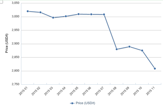 图1:中国1,1,1,2-四氟乙烷的出厂价,2015年1–11月