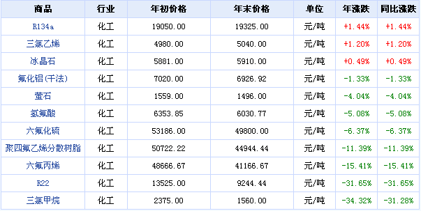 据生意社价格监测,2015年氟化工价格涨跌榜中上涨的商品共3种,下跌的商品共8种。上涨的主要商品有:R134a(1.44%)、三氯乙烯(1.20%)、冰晶石(0.49%);下跌的主要商品有:三氯甲烷(-34.32%)、R22(-31.65%)、六氟丙烯(-15.41%)。本年均涨跌幅为-9.68%。