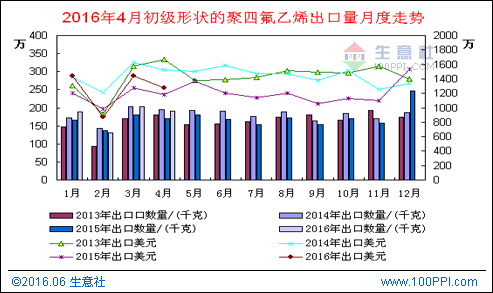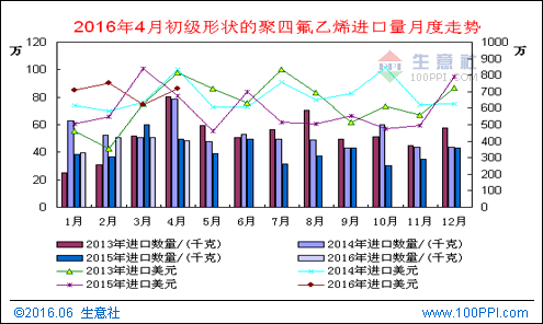 初级形状的聚四氟乙烯进出口数据分析(至201604):4月,39046100项下初级形状的聚四氟乙烯的进口量为481.782吨,环比减少4.49%,同比减少3.11%;进口均价14.87美元/千克,环比增加20.89%,同比增加9.40%;1-4月,初级形状的聚四氟乙烯的累计进口量为1886.8吨,同比增加1.86%;进口均价14.83美元/千克,同比增加%7.01%。