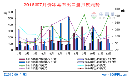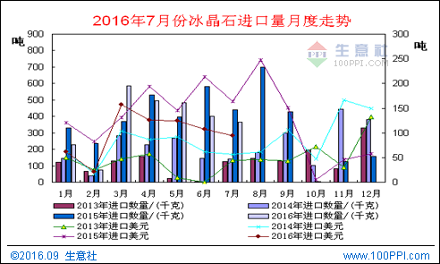 六氟铝酸钠(人造冰晶石)进出口数据分析(至201607):7月,28263000项下六氟铝酸钠(冰晶石)的进口量为3648.061 吨,环比减少9.42%,同比减少16.86%;平均进口均价0.259美元/千克,环比下降2.63%,同比减少27.91下降30.56%。1-7月,进口总量26346.653吨,同比减少8.56%;平均进口价格为0.262美元/千克,同比下降28.42%。