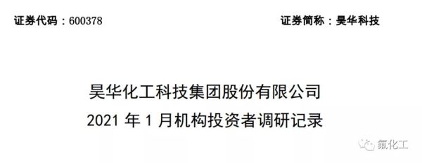 2月2日,昊华科技(600378)发布的《2021年1月机构投资者调研记录》中透露,2020年氟化工板块产品产能利用率接近100%。与此同时,氟化工板块毛利率亦凭借其中高端产品销售占比提升而较2019年有所提升。按趋势判断,三氟化氮整体需求量以年均 8-15%的速度增长,2021年产能预计1.8万吨/年,2025年达3万吨/年。调研记录如下: