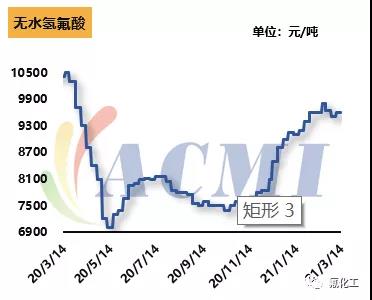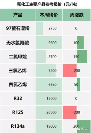 无水氢氟酸:上周无水氢氟酸价格盘整,由于原料硫酸价格小涨,部分区域报价探涨,但受下游制冷剂压价,场内价格涨幅受限,无水氟化氢市场送到价格在9500-9700元/吨。