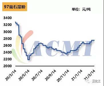 97萤石湿粉:两会期间炸药管制,加之部分企业装置停车仍未开工,行业开工率整体较低,萤石供应偏少;但反观下游需求疲软,实际价格上涨乏力,截至上周末,97%萤石湿粉市场价格走势暂稳,主流报价在2700-2800元/吨。