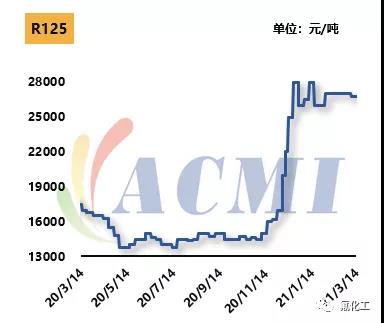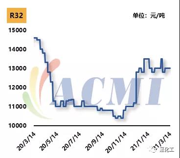 R32:氢氟酸价格暂稳,二氯甲烷价格延续上涨(3700元/吨),原料面整体成本上浮,但整体供应过剩现象明显,上周价格维稳,市场报价在130000-14500元/吨。