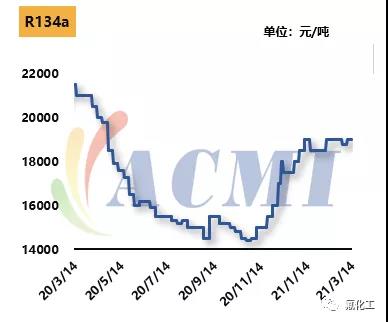 R134a:上周整体开工平稳,市场报价上涨。原料端氢氟酸行情维稳,三氯乙烯报价小幅下滑(7000元/吨),成本支撑较稳定,但下游需求不济。截至目前,市场主流报价在19000-20500元/吨。