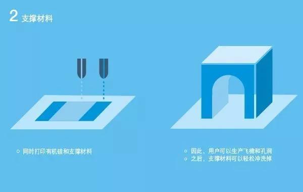 通过使用支撑材料来生产飞檐或孔洞等复杂结构,便能逐层打印出三维物体。打印完成后,将物体从工作平台上移除,并用水将支撑材料冲洗掉即可。随后将物体二次硫化,以便去除挥发物,并实现最终的机械性能。
