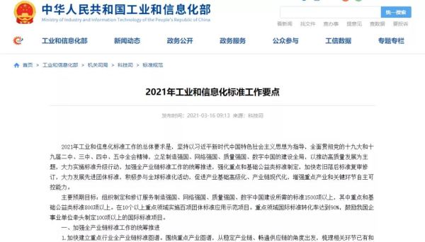 从工信部官网获悉,工信部科技司正式发布2021年工业和信息化标准工作要点。