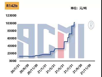 R142b:锂电行情热度不减,PVDF锂电粘结剂供不应求,R142b作为其主要原材料,供应持续紧张,价格强势上涨。截至周五,参考价格100000元/吨。