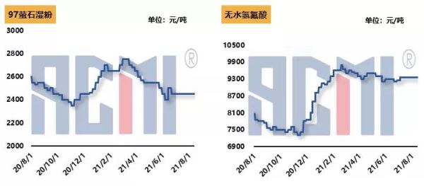 萤石/无水氟化氢:本周萤石粉和无水氢氟酸市场横盘震荡为主,需求端乏力,含氟锂电材料的高开工率对其基本面利好甚微,97萤石湿粉主流参考价2450元/吨附近,无水氟化氢主流参考价9300元/吨附近。