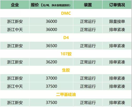 有机硅厂家大部分封盘不报,少数报价企业也是限量供货。DMC仍在36000元/吨高位。因为前期下游厂商持币观望,库存已经告急,所以市场交投气氛尚可。刚性补仓带来的是原料价位的继续坚挺运行。