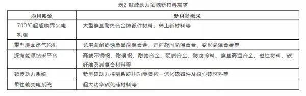 以煤炭为主和油气资源紧缺的能源结构,决定了我国国家能源战略发展重点在于发展新一代高效清洁燃煤发电技术和深海油气资源开发技术。先进能源动力系统用特种合金代表国家高端装备核心竞争力,属于国家战略型新材料范畴,是我国抢占技术制高点的重大机遇。核电、油气开发等能源领域重大项目对特种合金、稀土材料、非晶材料、超导材料、复合材料等新材料提出急迫需求(见表 2)。