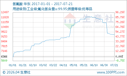 据生意社监测数据显示,国内氢氟酸价格自6月上旬以来,价格不断走低,由2017年价格高位11900元/吨,持续下滑至今,截止7月21日市场价格为9441.67元/吨,整体跌幅高达20%,氢氟酸市场价格跌跌不休。