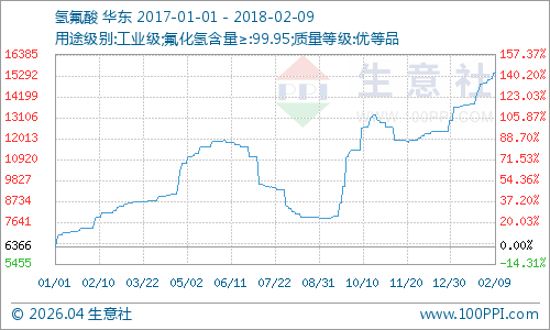 据生意社监测数据显示,近期国内氟化工原料萤石和氢氟酸价格持续走高,突破有史以来的价格高位,截止9日国内萤石出厂价格为3000元/吨,同比上涨94.81%,无水氢氟酸出厂价格为15475元/吨,同比上涨95.61%。自2011年生意社监测以来,近期萤石和无水氢氟酸的价格达到最高位水平,自2017年四季度开始,氟化工原料就开始持续上涨,截止2月中旬更是达到历史新高,原料领涨氟化工产业,制冷剂及终端下游价格相应走高,氟化工产业迎来开门红。