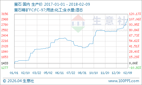 国内萤石价格近期持续上涨主要是由于以下几个方面,第一由于国内环保严查,自2017年以来国内萤石厂家关闭较多,国内萤石装置开工率严重不足,国内萤石供需矛盾十分尖锐,萤石价格持续大幅上涨。第二随着气温的降低,北方萤石市场装置逐步停车放假,使得紧俏的萤石价格更是步步高升,加之随着春节的到来,南方不少厂家放假,萤石货源更为紧张,萤石价格突破历史高位水平。第三下游市场需求增强,氢氟酸及制冷剂产品价格大幅上涨,对于萤石产品形成强有力的利好支撑,萤石价格大幅上涨。截止9日,北方萤石市场更是达到3200-3400元/吨的高位水平,南方萤石市场也在2800-3100元/吨,原料的上涨拉动整个行业价格大幅走高。