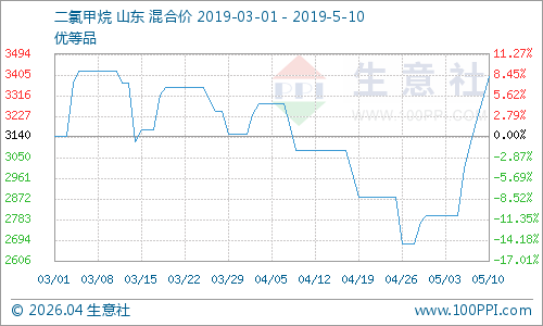 据生意社大宗数据监测显示,五一假期过后,国内甲烷氯化物价格持续走高,其中,山东地区二氯甲烷月初均价为2800元/吨,截至5月13日均价为3500元/吨,涨幅高达到25%;山东地区三氯甲烷月初2733元/吨,截至5月13日均价为3200元/吨,涨幅15.38%。