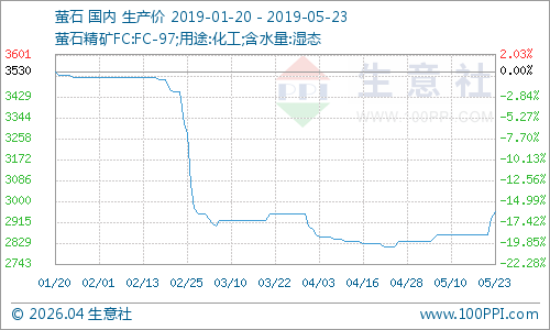 5月23日氟化工原料市场价格走势上涨,原料萤石价格价格为2956.25元/吨,近期国内部分萤石装置开工一般,场内矿山和浮选装置正常开工,场内萤石供应紧张,但是近期下游行情有所上涨,萤石价格受影响走高。南方萤石市场装置开工方面一般,南方地区萤石市场价格上涨。截止23日国内内蒙古地区萤石价格在2800-3000元/吨,福建地区萤石商谈主流在2700-3100元/吨,河南地区萤石价格在2700-3000元/吨,江西地区萤石价格在2800-3200元/吨,预计后期萤石价格或将小幅上涨。