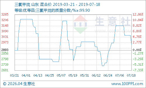 近期山东地区三氯甲烷价格小幅走低,三氯甲烷企业出厂价在2950元/吨左右,企业生产开工率较低,山东金岭44万吨/年装置开工正常,东营金茂12万吨/年装置检修,鲁西化工22万吨/年装置开工六成,国内三氯甲烷生产企业供应正常,库存低位。