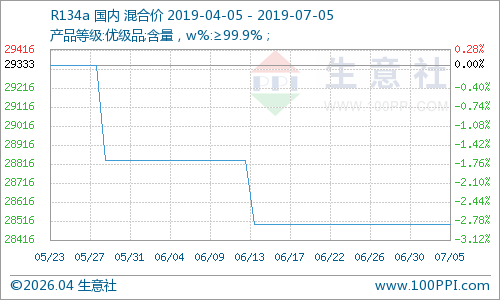 产品:据生意社数据监测,R134a制冷剂价格暂稳。 据生意社数据监测,截止7月05日,浙江巨化股份有限公司价格为28000元/吨,衢州市九洲化工有限公司价格为27500元/吨,山东粤安新型材料有限公司价格为30000元/吨,浙江冷王科技有限公司价格为28500元/吨, 江苏蓝色星球环保科技股份有限公司价格为30000元/吨。