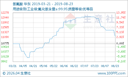 行业:本周上游原料萤石和氢氟酸市场现货供应正常,加之下游制冷剂行业交易行情较差,氢氟酸市场价格走势下滑。