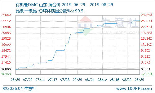 据生意社监测数据显示,本周初始,有机硅DMC市场报价稳中小幅零星上调,截止8月29日,综合几个主流地区报价,平均报价21200元/吨附近,较比8月23日,价格上调了200元/吨左右,上涨了0.95%。