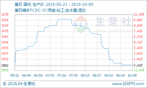 10月9日萤石商品指数为100.58,与昨日持平,较周期内最高点127.49点(2019-01-03)下降了21.11%,较2016年12月18日最低点49.21点上涨了104.39%。(注:周期指2011-09-01至今)