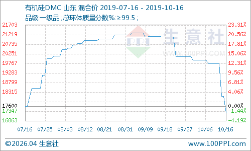 产品:国庆节过后,有机硅市场掀起波澜,节后第一天,10月8日,有机硅市场平稳运行,10月9日,随着询盘量的升温,价格快速跌落,节后大跌低突现,最高下调报价2000元/吨,扫货情况出现,。单体企业有机硅产品直接逼近成本价格接单,有机硅DMC成交价格低至16500元/吨附近(现汇送到),价格的大幅下降,致使下游备货心态积极,激发了大部分下游企业的抢购热情,大部分单体企业收获了节后的第一大单。10月10日,小部分工厂开始回调报价,报价上调 200-300元/吨附近,由于订单量的增多,各大单体厂盼涨心态明显,单体厂纷纷宣布开始排单生产,并且后期订单价格预计会回涨价格, 10月14日,大部分单体厂机硅DMC产品价格仍旧平稳,上调价格不明显,10月16日,有经销商最新报价再次下调,截止目前,有机硅市场整体仍旧触底待涨。