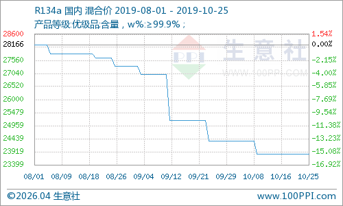 根据生意社价格监测,10月国内R134a出厂价格持续下行,截止月末(25日)价格为23833.33元/吨,较月初(1日)价格24333.33元/吨走势下2.05%,与去年同期相比下跌18.75%。