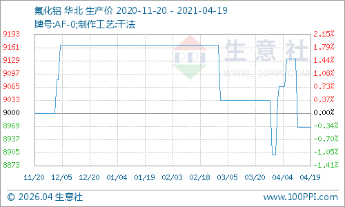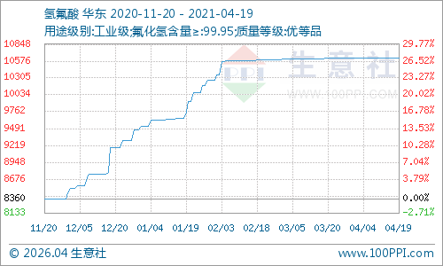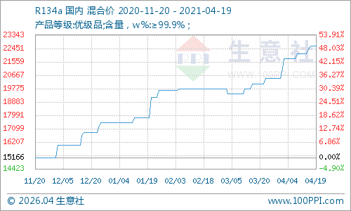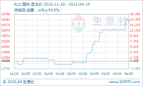 2021年4月19日氟化工价格涨跌榜中上涨的商品共1种,下跌的商品共2种,涨跌为0的商品共4种。上涨的商品包括:三氯甲烷;下跌的产品包括:萤石和R22;平稳的产品包括:氢氟酸、氟化铝、R134a和冰晶石。