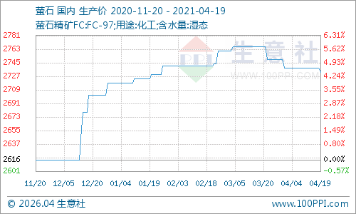 4月19日氟化工原料市场部分价格下滑,原料萤石价格价格为2733.33元/吨,萤石价格走势小幅回调,近期国内部分萤石装置开工一般,场内矿山和浮选部分装置停车,场内萤石供应正常,但是近期下游行情稳定为主,萤石价格受影响跌幅有限。截止19日国内江西地区萤石价格在2700-2800元/吨,内蒙古地区萤石价格在2500-2600元/吨,预计后期萤石价格或将维持高位稳定。