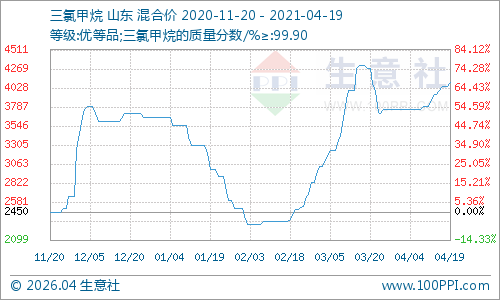 近期山东地区三氯甲烷价格走势上涨,下游市场整体需求变化不大,对三氯甲烷需求一般,随着下游市场按需采购,三氯甲烷市场价格走势小幅上涨。目前国内三氯甲烷价格在3950-4050元/吨。一方面下游制冷剂需求放量,三氯甲烷出货顺畅,需求面支撑;另一方面3月下旬以来原料液氯价格走高,成本面支撑力度较强。