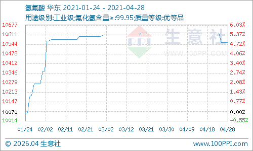 萤石下游氢氟酸市场价格略有下滑,截止月末国内氢氟酸市场价格为10555.56元/吨,4月份跌幅为0.63%,氢氟酸市场价格走势回落对于上游萤石市场有一定的利空影响,萤石价格走势下滑。国内制冷剂行情走势上涨,近期汽车行业销售行情好转,制冷剂行情有所好转,需求按需采购为主,制冷剂行业走势有所上涨,多种型号制冷剂行情略有上涨,但是厂家出货承压,销售压力较大,原料氢氟酸价格走高,带来一定的成本支撑,制冷剂出口量变化不大,下游空调产量低位,需求稀少,售后市场淡季效应延续,制冷剂价格涨幅不大。制冷剂市场整体来看利好因素支撑一般,价格涨幅有限。目前制冷剂R22生产厂家负荷不高,库存在合理区间,市场价格维持低位水平,但下游接货能力有限,观望情绪颇多,持货商出货不畅,实际成交重心略有上涨,部分商家仍有成本倒挂现象,场内商谈主流在15500-17000元/吨水平。国内R134a厂家降负荷运行,利好支撑R134a价格上扬。当前需求面跟进不足,车市需求欠佳,加之高价R134a新单成交一般,下游接货能力有限,观望情绪浓厚。目前R134a市场报价多在19000-22000元/吨区间,但成交氛围一般,下游制冷剂行情好转,萤石价格走势有所支撑,萤石价格小幅回落。