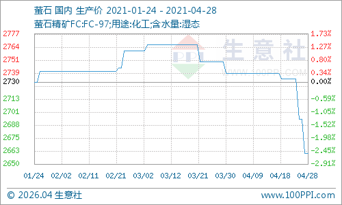 据统计4月份国内萤石价格走势持续下滑,截止月末国内萤石均价为2661.11元/吨,较月初价格2738.89元/吨下滑2.84%,同比下滑4.20%。