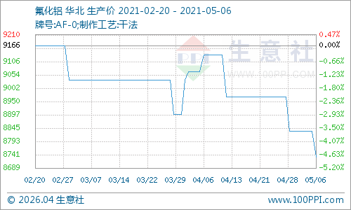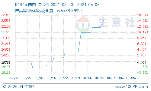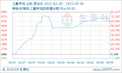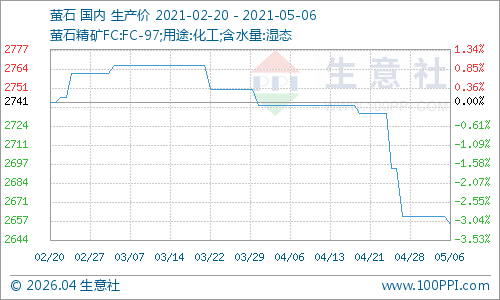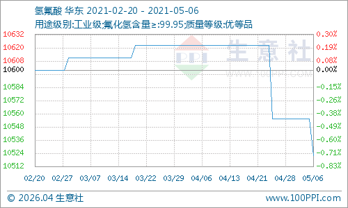 2021年5月6日氟化工价格涨跌榜中上涨的商品共0种,下跌的商品共4种,涨跌为0的商品共3种。下跌的产品包括:萤石、氢氟酸、氟化铝和三氯甲烷;平稳的产品包括:R134a、R22和冰晶石。