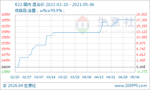 近期下游制冷剂R22价格走势暂稳,原料三氯甲烷价格走势稳定,成本面支撑情况较强,近期下游按需采购为主,需求面变化不大,市场重心维持高位,由于氢氟酸价格走势稳定为主,制冷剂受影响部分价格暂稳。制冷剂R134a价格走势有上涨趋势,行情偏强运行。近期下游开工维持低位,但是原料支撑有力,制冷剂行情走势暂稳。