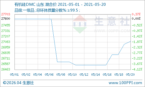 根据生意社监测数据显示,截止5月20日,数据监测主流地区有机硅DMC市场报价均价参考在27100元/吨,与5月14日(有机硅DMC参考均价26566元/吨)相比,均价上调534元/吨,涨幅2.01%,与5月1日(有机硅DMC参考均价27600元/吨)相比,均价下调500元/吨,跌幅1.81%。