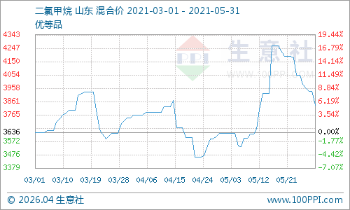 5月二氯甲烷市场先涨后跌,整体上行。据生意社大宗数据监测显示,月初二氯甲烷价格在3630元/吨,后上涨至5月17日的月内高点4263元/吨、月底下滑至3833元/吨。整体月底较月初上涨5.60%。