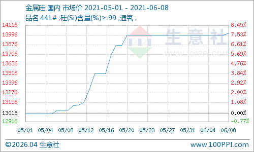 上游方面,2021年5月上游金属硅(441#)价格强势运行。据生意社数据显示,5月31日国内金属硅(441#)市场均价为13991.67元/吨,较5月初(5.1)市场均价13641.67元/吨,涨幅为7.49%。涨幅主要在5月中上旬,下半月金属硅(441#)价格基本持稳运行为主。进入六月,金属硅持续高位坚挺运行,截止8日,福建地区#441硅市场价格维稳,目前价格区间在13300-13400元/吨,市场均价13300元/吨;昆明地区#441硅市场价格维稳,目前价格区间为13800-13900元/吨,均价13850元/吨;上海地区金属硅市场#441硅价格维稳,目前价格区间在14600-14800元/吨,均价14700元/吨;黄埔港地区#441硅市场价格维稳,目前价格区间在14100-14200元/吨,市场均价14150元/吨;天津港地区#441硅市场价格小幅上涨,目前价格成交区间在14200-14300元/吨,市场均价为14250元/吨。