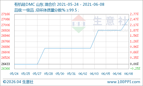 根据生意社监测数据显示,截止6月8日,数据监测主流地区有机硅DMC市场报价均价参考在27100元/吨,与6月1日(有机硅DMC参考均价26666元/吨)相比,均价上调433元/吨,涨幅1.62%,与5月24日(有机硅DMC参考均价26433元/吨)相比,均价上调677元/吨,涨幅幅2.52%。