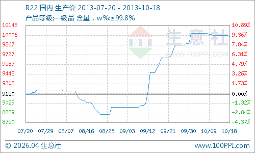 据生意社大宗榜数据显示,本周国内R22行情小幅走软,周初国内企业出厂报价均价10000元/吨,周末国内企业出厂报价均价9990元/吨,整体下滑0.10%。