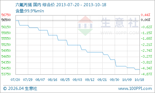 据生意社大宗榜数据显示,本周国内六氟丙烯行情稳定。周初国内企业出厂报价均价在54083元/吨左右,到本周末国内企业对外报价波动至54000元/吨左右,整体变化了0.15%,当前价格同比去年下降了31.95%。