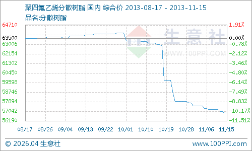 产业链,上游原料R22价格下滑,下滑幅度为0.89%,开工情况正常,走货量一般,利空聚四氟乙烯分散树脂价格,下游需求稳定,无明显利好支撑,贸易商经过一段时间的补库存后,库存充足,询价不积极。