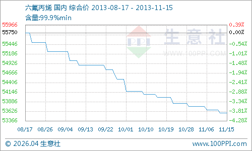 产业链,上游原料R22价格下滑,下滑幅度为0.89%,开工情况良好,大约在八成左右,利空六氟丙烯价格,下游需求一般,厂家维持固定的走货量,灭火剂市场交投平衡,贸易商询价不积极,难以拉动六氟丙烯市场。