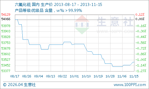 据生意社大宗榜数据显示,本周国内六氟化硫行情略有走强,周初国内企业出厂报价均价53460元/吨,周内国内企业出厂报价均价53500元/吨,整体上涨0.07%。