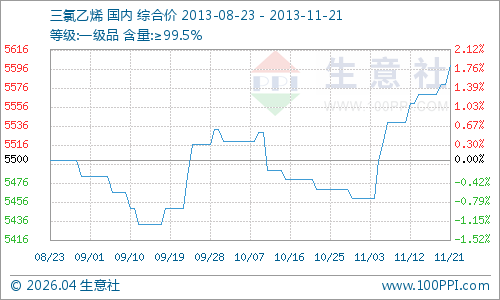 11月21日辽宁地区三氯乙烯市场行情平稳,桶装主流市场行情5500元/吨左右,市场供应稳定,下游制冷剂行业及清洗行业需求不好,交投情况尚可;11月21日宁夏地区三氯乙烯市场行情平稳,桶装主流市场行情5450-5500元/吨左右,市场供应平稳,下游制冷剂行业及清洗行业需求尚可,交投情况尚可;11月21日华东地区三氯乙烯市场行情走强,桶装主流市场行情6000元/吨左右,市场供应平稳,下游制冷剂行业及清洗行业需求不好,交投情况一般。