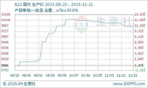 11月21日浙江地区制冷剂R22市场行情盘整,生产厂家主流出厂报价在9700-9800元/吨左右,下游PTFE及空调行业需求不理想,贸易商交投尚可,厂家走货平稳;11月21日山东地区制冷剂R22市场行情平稳,生产厂家主流出厂报价在9800元/吨左右,下游PTFE及空调行业需求一般,贸易商交投尚可,厂家走货平稳;11月21日江苏地区制冷剂R22市场行情走软,生产厂家主流出厂报价在9700元/吨左右,下游PTFE及空调行业需求一般,贸易商交投尚可,厂家走货一般。