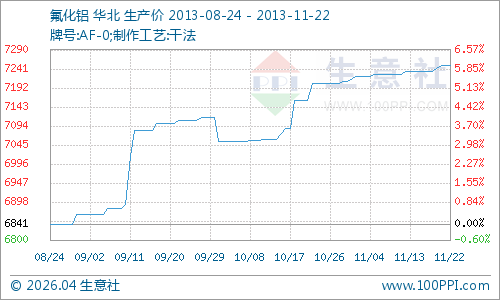 据生意社大宗榜数据显示,本周国内干法氟化铝行情相对稳定。周初国内企业出厂报价均价在7235元/吨左右,到本周末国内企业对外报价波动至7250元/吨左右,上涨幅度为0.20%。