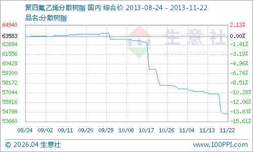 产业链,上游原料R22价格略有下滑,下滑幅度为0.10%,开工情况正常,走货量一般,利空聚四氟乙烯分散树脂价格,下游需求稳定,无明显利好支撑,贸易商经过前一段时间的补库存后,库存充足,询价不积极。
