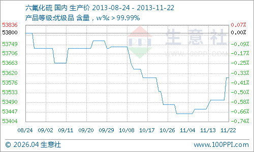 据生意社大宗榜数据显示,本周国内六氟化硫行情略有上涨,周初国内企业出厂报价均价53500元/吨,周内国内企业出厂报价均价53600元/吨,整体上涨0.19%。