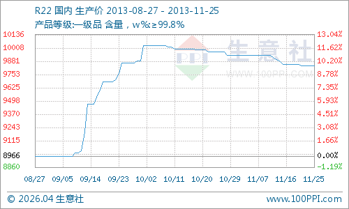 11月25日江苏地区制冷剂R22市场行情盘整,生产厂家主流出厂报价在9700-9800元/吨左右,下游PTFE及空调行业需求一般,贸易商交投尚可,厂家走货一般;11月25日浙江地区制冷剂R22市场行情盘整,生产厂家主流出厂报价在9700元/吨左右,下游PTFE及空调行业需求不理想,贸易商交投尚可,厂家走货平稳;11月25日山东地区制冷剂R22市场行情平稳,生产厂家主流出厂报价在9800元/吨左右,下游PTFE及空调行业需求一般,贸易商交投尚可,厂家走货平稳。